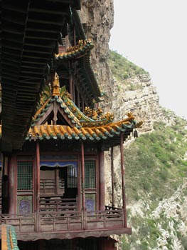 | The next day we drove out of town to the Hanging Monastery in Yingxian. This reminds me somewhat of the Anastazi dwellings in Mesa Verde (southern Colorado). The monastery was built above a river, which has since receded in level, and the builders had to lower themselves down from above. The monastery incorporates shrines for all three of China's major religions: Buddhism, Daoism and Confucianism. There is a path and walkway to go through most of the existing structures. The architectural decorations are very beautiful, Qing facade added to Northern Wei construction. |